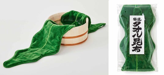 「タオル昆布」として贈答品のような佇まいで店頭に並ぶ(写真)この商品は、妄想を形にする「妄想商品化道場」という企画にて、「海を感じる日用品」というお題で人気投票一位を獲得してデビューしました。お風呂やプールなど、水場で使うとその存在感が際立ちます。ぬれると色が濃くなり、さらに昆布感アップ! 物干し竿にぺロンと干せば、ベランダが漁港のような風景に。高校生の男女グループが集団で購入していく様子が見られるなど、お土産用タオルとして一番人気です。