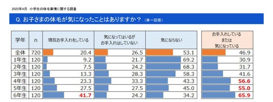 株式会社鈴木ハーブ研究所は、25~49歳の女性で小学1年生から6年生までの女児の母親を対象に、「お子さまの体毛事情に関する調査」を実施しました。調査結果の一部を抜粋して発表します。