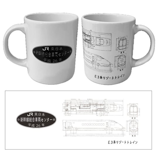 銘板と先頭車体図が描かれたマグカップです。