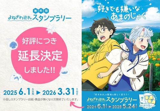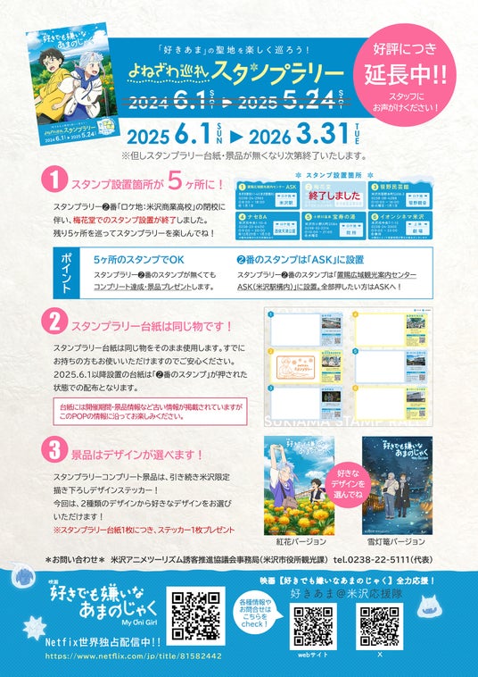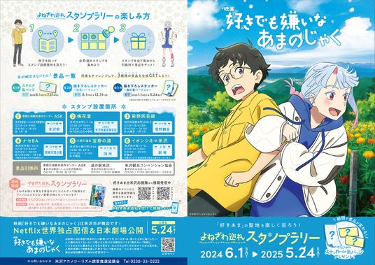 2024年5月24日(金)よりNetflix世界独占配信中の長編アニメーション映画「好きでも嫌いなあまのじゃく」(監督:柴山智隆、企画・製作:ツインエンジン、制作:スタジオコロリド)を全力で応援する「好きあま@米沢応援隊」(運営:米沢アニメツーリズム誘客推進協議会(所在地:山形県米沢市、会長: 伊藤優子))・会員:プラットヨネザワ株式会社(所在地:山形県米沢市、代表取締役 宮嶌浩聡))は「好きあま」のロケ地を楽しく巡る「【無料版】よねざわ巡礼スタンプラリー」の延長を決定いたしました。