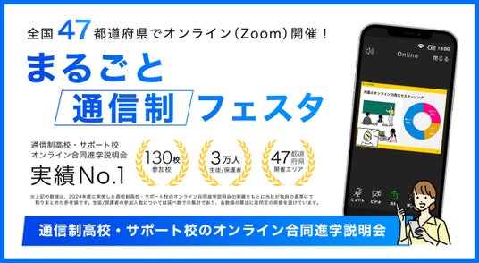 昨年度3万人以上の中学生・高校生・保護者が参加した、業界最大級の通信制高校・サポート校のオンライン合同進学説明会「まるごと通信制フェスタ」が、6/14から全国47都道府県を対象に順次開催