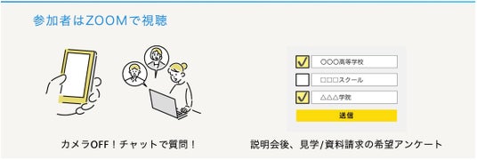 本イベントの最大の特長は、すべてオンラインで開催される点です。Zoomを使用するためスマートフォンからワンタップで参加でき、生徒・保護者の皆さまはカメラやマイクをオンにする必要がありません。質問もチャットで受け付けるため、プライバシーに配慮した安心設計となっています。