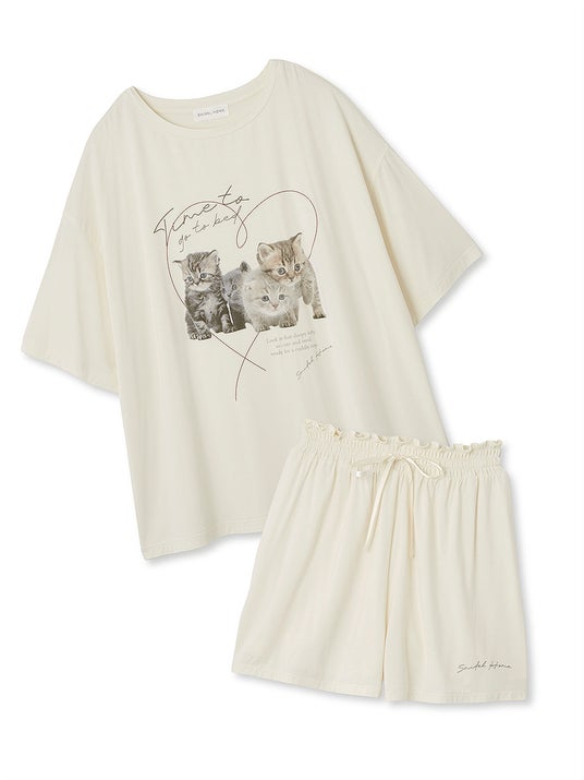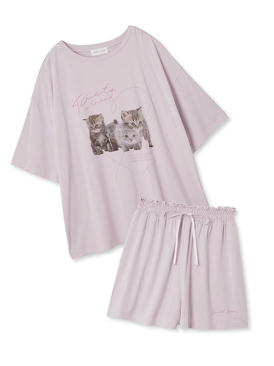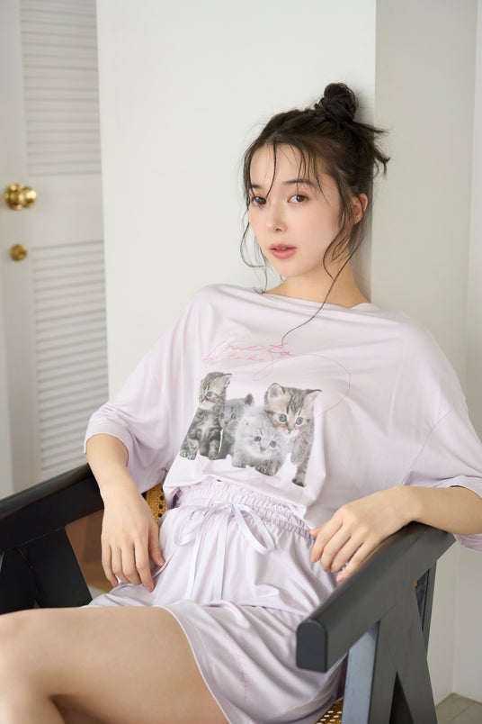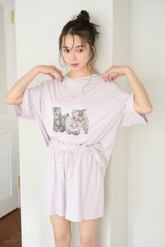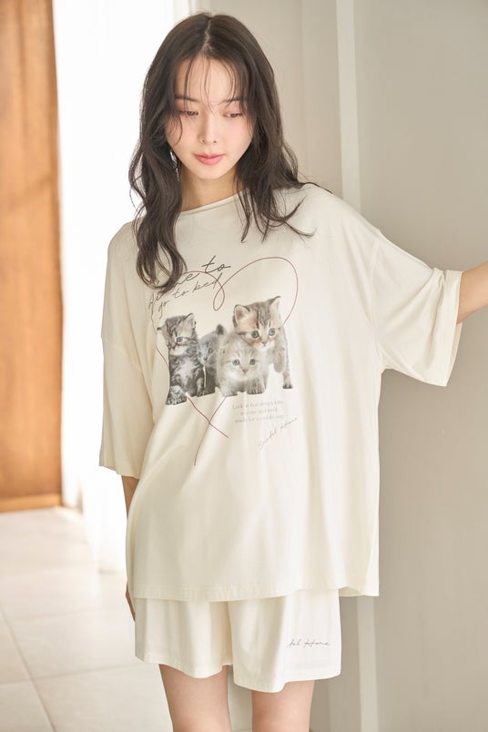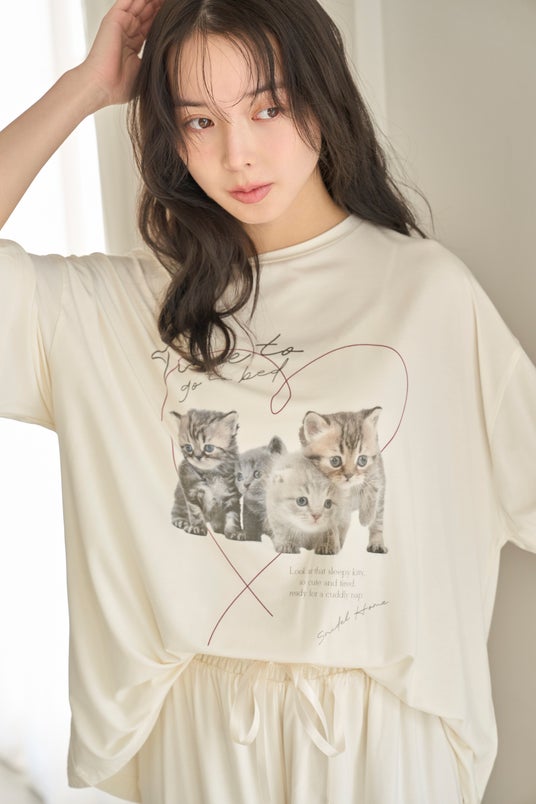SNIDEL HOMEで人気のTシャツセットアップのデザインに、キャッチーで愛くるしい子猫のプリント柄が登場しました。とろみのあるレーヨンで、肌に吸い付くようななめらかな着心地。薄手のカットソーを使用しているので、お手持ちのカーディガンなどとのコーディネートもおすすめです。