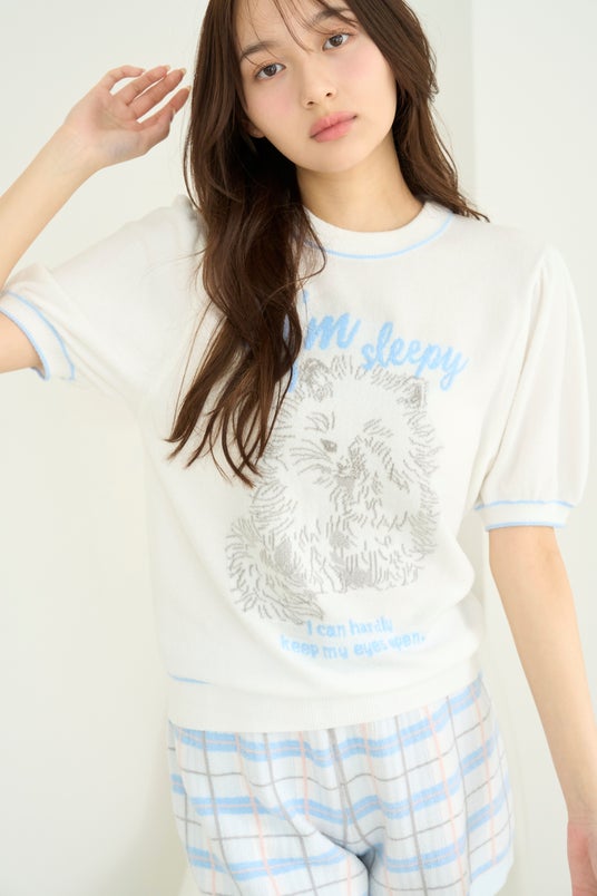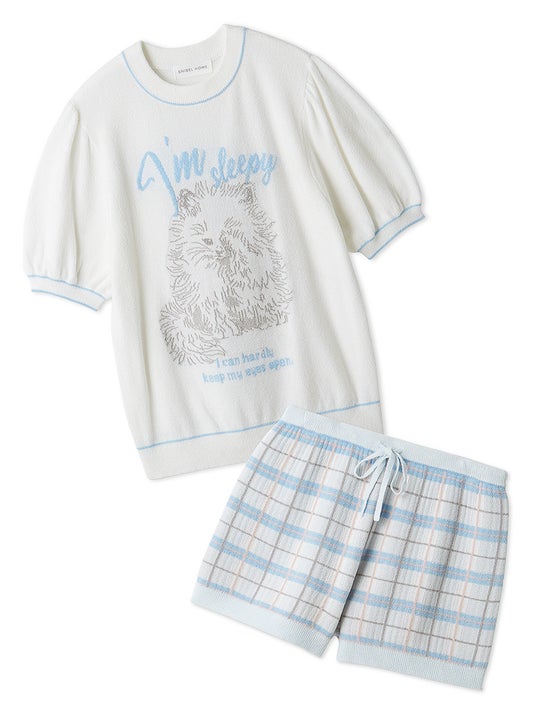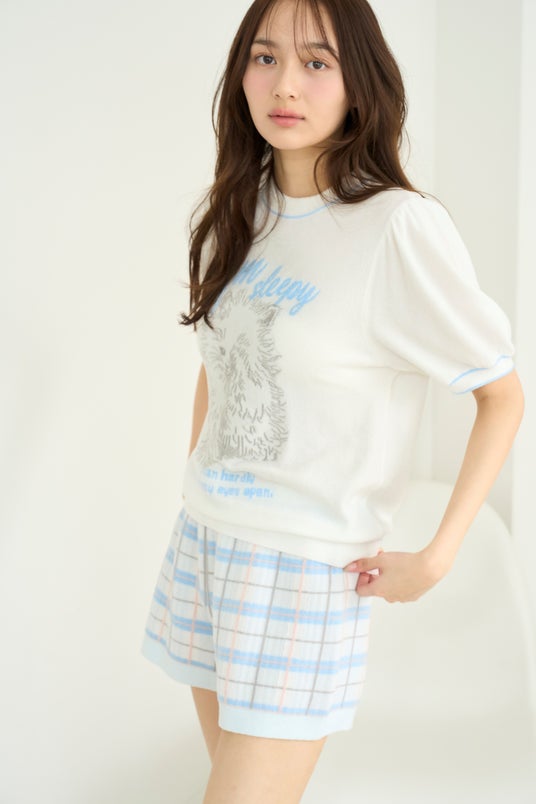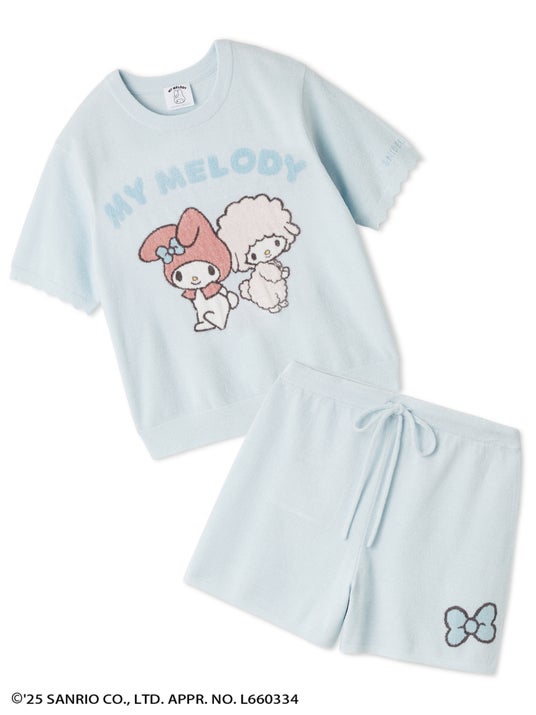 トップスは爽やかなライトブルーに仲良しのキャラクターをジャガードでデザインしたキュートな半袖プルオーバー。ショートパンツは左裾にリボンの刺繍をあしらっています。
