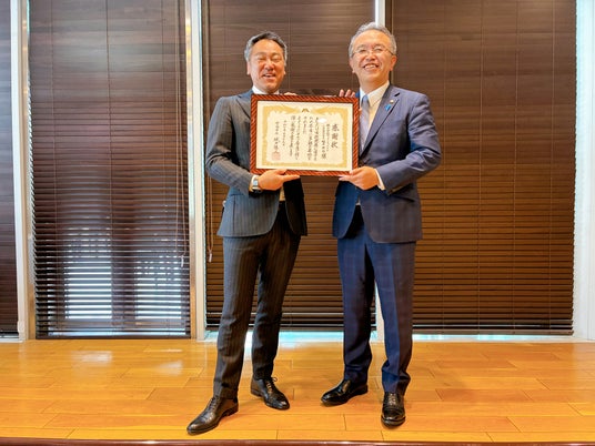 感謝状を持つ城戸陽二市長(写真右)と福井朋也代表取締役(写真左)