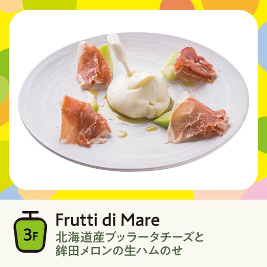 リッチでクリーミーなブッラータチーズに、メロンの甘味と生ハムの塩味がベストマッチ。上質な生ハムメロン。/¥1,870