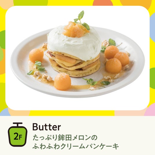 メロンとカスタードをサンドした3枚のパンケーキ。ふんわり軽いメロンクリームでみんなを笑顔に!/¥2,420