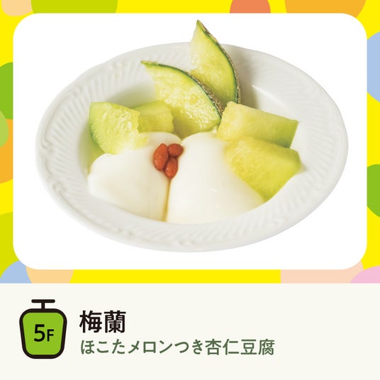 とろける杏仁豆腐にメロンを添えて。なめらかでつるんとした杏仁豆腐とジューシーなメロンが口の中でミックスされて、幸せいっぱいに。/¥780