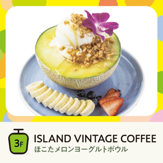 1/2カットのメロンにココナッツアイスをON。グラノーラにヨーグルト、オーガニックハニーやフルーツも加わってハワイ気分を満喫!/¥2,690