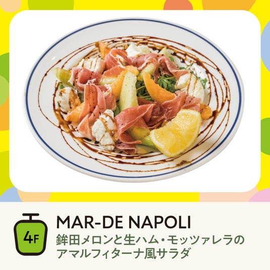 水牛モッツァレラのコクとほろ苦いルッコラ、メロンの甘味が好相性!バルサミコとレモンの酸味でさっぱりと。/¥1,815