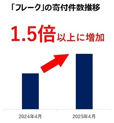ふるさと納税には、米やその代替品をよりおいしく食べられる「ごはんのおとも」が多数掲載されています。「フレーク」がタイトルにつくお礼品の2025年4月の寄付件数は前年同月比で1.5倍以上に増加し、同じく「ふりかけ」がタイトルにつくお礼品の寄付件数も前年同月比で約1.3倍に増加しました。