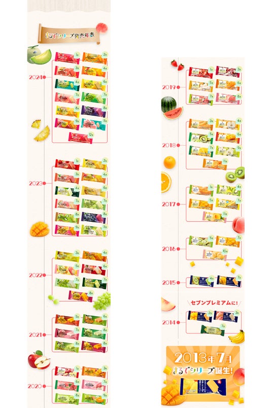 2013年よりマンゴーアイスの開発を進めていました。果肉ゴロゴロのアイスを目指し、当時はまだ珍しかった冷凍食品のマンゴーに着目。その食感、おいしさを参考に様々な試行錯誤を繰り返し、ねっとり濃厚仕立ての「まるでマンゴーを冷凍したような食感のアイスバー」が誕生しました。その後、「冷凍した果物をそのまま食べているような食感のアイス」「旬の時期に食べたいフルーツを手軽に食べることができるアイス」をコンセプトに、現在にいたるまで様々なアイスを表現してきました。