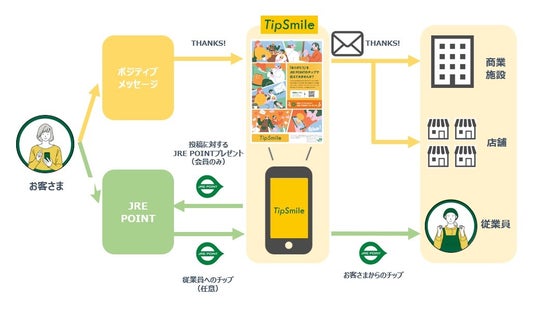 「TipSmile」は店舗やショップスタッフに宛て、お客さまの感謝や応援の想いを届けるサービスです。商業施設をご利用のお客さまが、店頭の「TipSmile」専用二次元コードやSNS等で配信される専用URLから「TipSmile」のサイトにアクセスするだけの簡単操作で、店舗やショップスタッフにポジティブなメッセージを送信することができます。