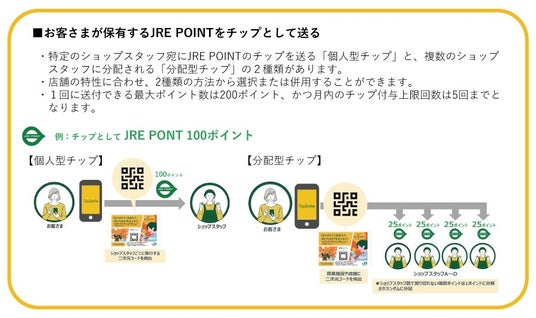 また、JRE POINTをチップとしてショップスタッフに送信する機能を備え、お客さまご自身のJRE POINTから1回に最大200ポイントを届けることができます。