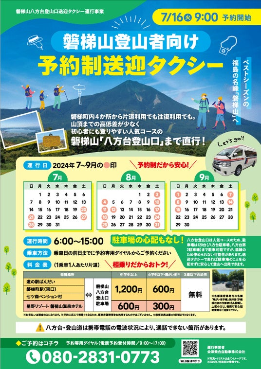 福島県磐梯町(町長:佐藤淳一、以下「磐梯町」)は、2024年7月20日から9月15日までの土・日・祝日に町内の主要な観光施設から、磐梯山八方台登山口までを結ぶ予約制送迎タクシーを運行しております。多くの方に磐梯山登山を楽しんでいただくと同時に、磐梯町の商業施設や宿泊施設をアウトドアレジャーの起点・拠点として活用されることで、町の活性化に繋げてまいります。