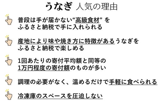 「うなぎ」の人気には以下の5つの理由が考えられ、ふるさと納税を活用して贈答用にする際のお礼品としても人気があります。