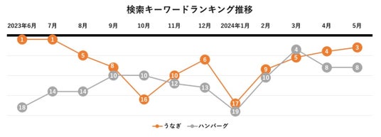 「さとふる」における検索キーワードのランキング推移を見ると、「うなぎ」は10月・1月を除き年間を通して10位以内をキープしています。同じく、ふるさと納税で人気の「ハンバーグ」と比較しても「うなぎ」の人気の高さがうかがえます。