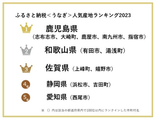 2023年の「うなぎ」カテゴリの寄付件数を基にした人気産地ランキングでは、養殖うなぎ収穫量1位(※)の鹿児島県が2年連続1位となりました。他の産地ではうなぎを提供する自治体が限られているのに対し、鹿児島県では県内の複数自治体でお礼品を提供しており、人気を集めています。続く2位には和歌山県がランクインし、有田市に本社を構える「うなぎ屋かわすい」のうなぎに多くの寄付が集まり、順位を押し上げました。3位には、「うなぎ」カテゴリの人気お礼品ランキング1位を獲得した上峰町がある佐賀県がランクインしました。