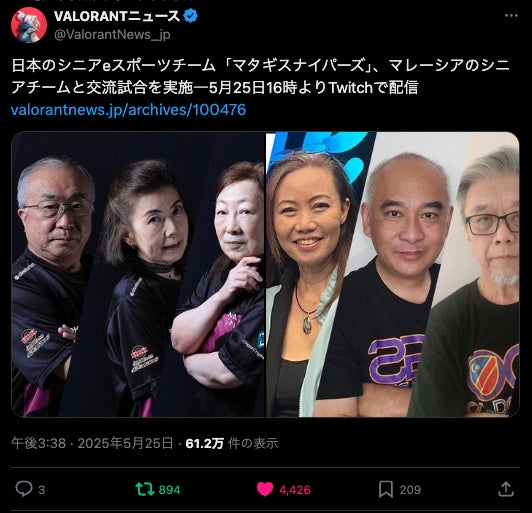 試合直後に結果をアナウンスしたMATAGI SNIPERSの投稿には、数多くの「いいね」やリポスト、コメントが寄せられました。「おれもこんな爺さんになりたいな」「日本ヴァロラントの星すぎる」「日本のeスポーツの未来は明るい」といった声や、秋田県出身者と思われる方から「信じられるかこれ... 地元なんだぜ? かっこよすぎるだろ」といった温かいコメントが見受けられ、今回の国際交流試合が多くの人々に感動と希望を与えたことが伺えます。