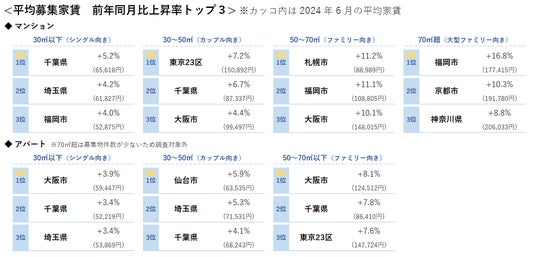 <2024年6月 全国主要都市における賃貸マンション・アパートの平均家賃(面積帯別)>