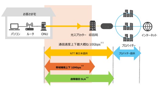 本サービスは、お客さまが契約するインターネットサービスプロバイダーさま(以下、ISP事業者さま)等へ上り/下り最大概ね 10Gbpsの通信速度で接続するベストエフォートサービスです。帯域確保上り/下り10Mbps、故障復旧SLA99.99%、サポート体制として従来の24時間出張修理オプションの機能に加え、業界最高水準の24時間以内駆けつけ保証※1など、法人のお客さま向け機能を具備し、より安心してご利用いただけます。