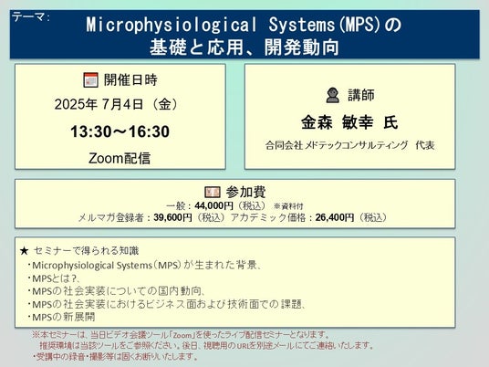 先端技術情報や市場情報を提供している(株)シーエムシー・リサーチ(千代田区神田錦町: https://cmcre.com/ )では、 各種材料・化学品などの市場動向・技術動向のセミナーや書籍発行を行っておりますが、 このたび「Microphysiological Systems(MPS)の基礎と応用、開発動向」と題するセミナーを、 講師に金森 敏幸 氏(合同会社 メドテックコンサルティング 代表)をお迎えし、2025年7月4日(金)13:30より、 ZOOMを利用したライブ配信で開催いたします。 受講料は、 一般:44,000円(税込)、 弊社メルマガ会員:39,600円(税込)、 アカデミック価格は26,400円(税込)となっております(資料付)。