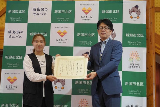 紙芝居の寄贈式がかやま保育園で行われ、丸山寛・新潟市北区長、西原康行・同大学副学長(社会連携担当)、学生などが出席しました。