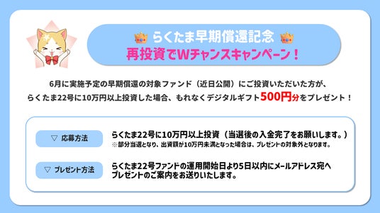 今回早期償還を実施した11号・15号・16号ファンドに出資した投資家様を対象に、償還金の一部をらくたま22号ファンド(次のご案内参照)へ再投資いただくと、もれなくデジタルギフトが貰える「Wチャンスキャンペーン!」を開催いたします。詳細は下記スライドをご参照ください。