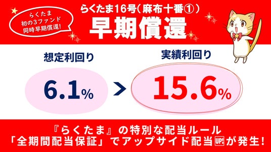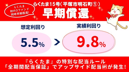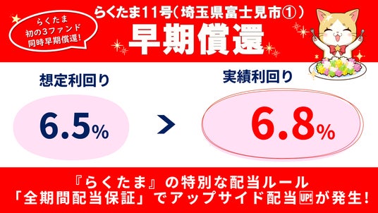 『らくたま』では、本年1月24日に、らくたま8号(想定利回り:5.5%→実績利回り:8.76%)、らくたま10号(想定利回り:5.5%→実績利回り:15.7%)、3月17日には、らくたま10号(想定利回り:6.3%→実績利回り:31.6%)、らくたま18号(想定利回り:6.1%→実績利回り:1642.5%)において、早期償還によるアップサイド配当を実施し、投資家の皆様に想定を上回る利益還元を行いました。そして今回、5回目、6回目、7回目となる同時期でのアップサイド配当により、さらに大きな利益還元を達成いたしました。