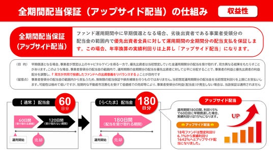 『らくたま』の特別な配当ルール「全期間配当保証」とは、ファンドが早期償還となった場合、通常は投資家が受け取ることが出来ない未経過期間分(残期間分)の配当のお支払いを保証する全く新しい仕組みです。
