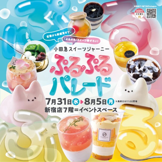 小田急百貨店新宿店7階のイベントスペースでは、7月31日(水)~8月5日(月)の期間、「小田急スイーツジャーニー ぷるぷるパレード」を開催します。ゼリーやプリン、わらび餅などの約200種の‟ぷるぷるスイーツ“を一堂に展開します。