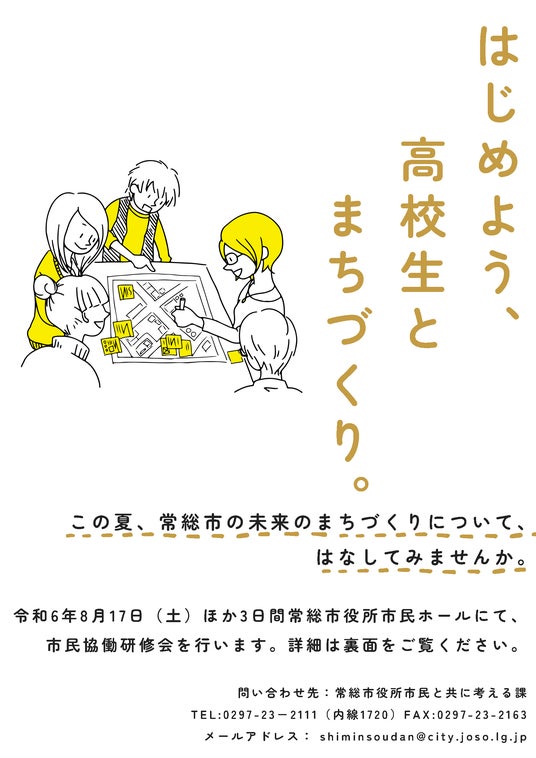 常総市の将来を見据えたまちづくりについて,地域住民の方々と高校生の視点を交え話し合う研修会を開催します。