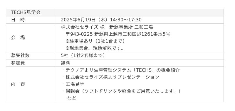 株式会社テクノア(本社:岐阜県岐阜市、代表取締役:山崎 耕治)は、生産管理システム『TECHS』シリーズの導入現場を体験して学べる「TECHS見学会」を、2025年6月19日(木)に開催します。