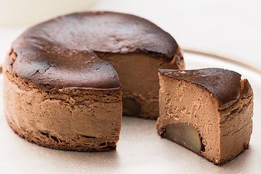 チョコレートのバスクチーズケーキ 笠間の栗入り甘く香り高い茨城県産笠間の栗と、フランス産の華やかさと酸味が特徴のカカオ分64%の濃厚なチョコレートが絶妙なおいしさを奏でます。