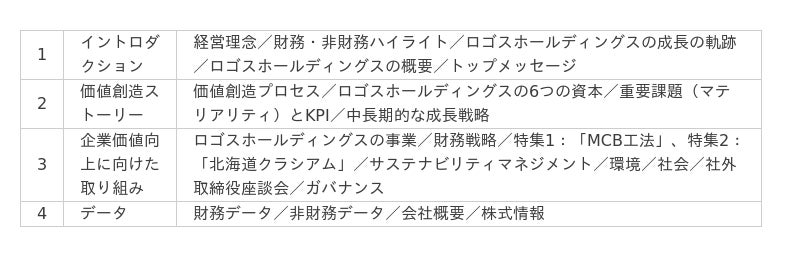本報告書は、ロゴスホールディングスグループが目指す「持続可能な価値創造」と「企業価値の長期的な成長」に向けた取り組みを、誠実かつ分かりやすくお伝えすることを目的に作成されたものです。2030年の目指す姿を実現するための中長期の価値創造プロセスをはじめ、成長戦略、財務情報、サステナビリティの取組みなどを包括的に整理し、株主・投資家をはじめとする多様なステークホルダーのみなさまに深くご理解いただける内容となっています。
