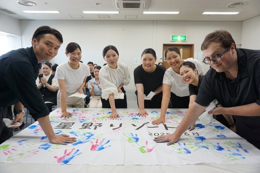 「旅を楽しくする」をテーマに国内外71施設を運営する星野リゾートは、2025年6月5日に「BEB5土浦 by 星野リゾート」(茨城県土浦市)で入社式を実施しました。星野リゾートでは入社時期を4月、6月、10月、2月の年4回に分け、新入社員が個人の意思で入社時期を選択できる採用の枠組みを設けています。6月入社式には、62名の新入社員が出席し、これから働く決意をこめて手のひらを絵具に浸し、手形を押す「契りの手形」を交わしました。新入社員は、4日間の研修「Warm-up Camp」を通じてホテル運営や組織の価値観を学び、その後、全国各地の施設へ着任します。