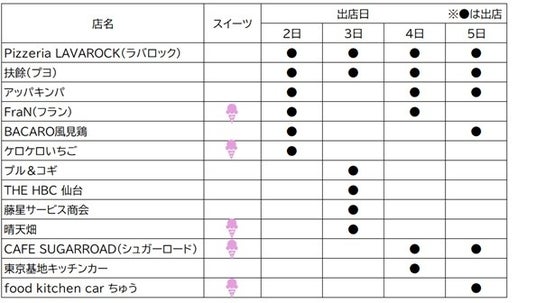 本イベントは、定番の韓国グルメである、チヂミやキンパ(韓国風のり巻き)の他、暑さ和らぐ韓国スイーツを提供するキッチンカーなど、のべ13店舗が日替わりで出店予定です。昨年の売れ筋商品である、「扶餘(プヨ)」のチヂミや10円パン、「アッパキンパ」のキンパは本年も販売予定のほか、新登場である「food kitchen car ちゅう」では、韓国発祥スイーツのクロッフルなどを販売予定です。仙台トラストシティ内にある「Pizzeria LAVAROCK 仙台」では、人気マルゲリータピザのほか、韓国グルメフェスとコラボしたイカチヂミ風ピザやヤンニョムチキンを販売いたします。この機会にしか味わえないコラボ商品をぜひご賞味ください。