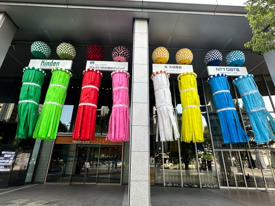 東北の伝統行事「仙台七夕まつり」に合わせ、仙台市内最大級である全長5m40cmの豪華絢爛なオリジナル吹き流しを仙台トラストシティに設置しています。夏の空に映える、彩り豊かな8本の吹き流しを、ぜひご覧ください。