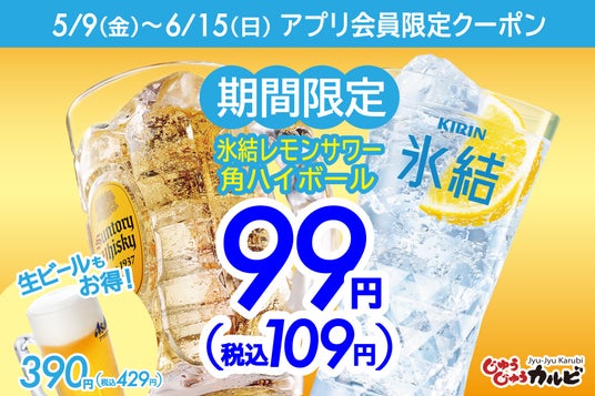 ダウンロード後、会員登録をするとご利用いただけます。氷結レモンサワー、角ハイボールなら何杯飲んでも1杯99円(税込109円)!ぜひこの機会にご利用くださいませ。詳しくはじゅうじゅうカルビ公式アプリのクーポンをご確認ください。