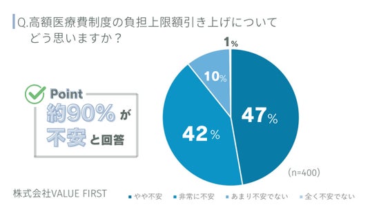 「高額医療費制度の負担上限額引き上げについて、どのように思いますか?」という質問には、400人中168人が「非常に不安」、189人が「やや不安」、42人が「あまり不安ではない」、1人が「全く不安でない」と回答しました。