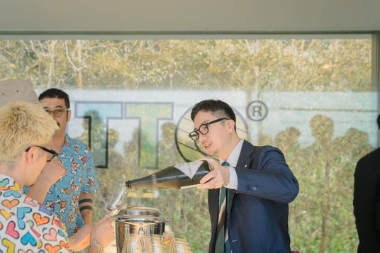 2025年4月のロメロ・ブリット氏のパーティーでSAKE HUNDREDのお酒を注ぐブランドオーナー生駒/場所:tracks-Artists in residence,Kamakura