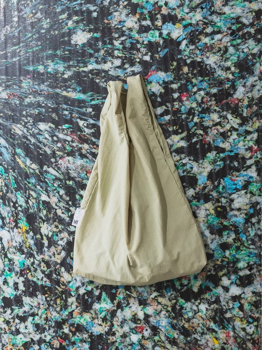 今回展示販売するセットアップとバッグは、宮城県気仙沼市で回収した漁網由来繊維を製品全体で49%使用(重量比)しています。経糸は国内漁網100%のamuca(R)繊維、緯糸は海外原料のマテリアルリサイクルNylon6の繊維を使用しています。(原料問わず、生地全体のリサイクル材活用率は100%)
