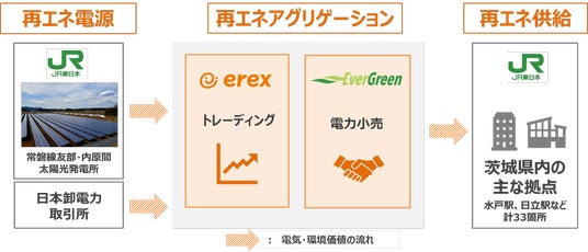 ・JR東日本が保有する内原太陽光発電所の適用制度をFITからFIPへ切り替え、イーレックスに電力と環境価値を供給します。イーレックスはJR東日本に代わって電力の需給調整を行い、イーレックスグループの販売子会社であるエバーグリーン・マーケティング株式会社を通じて、内原太陽光発電所により生み出された環境価値を安定的にJR東日本に供給します。