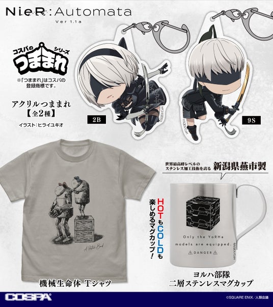 「2B」「9S」のアクリルつままれをはじめ、「機械生命体」のTシャツや、「ヨルハ部隊」のトートバッグなどがCOSPA(コスパ)から登場!