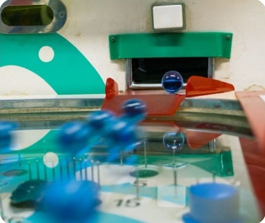 当たりの穴に玉が入ると、持ち玉が増えるゲーム。棒で玉をはじいて当たりを狙おう!