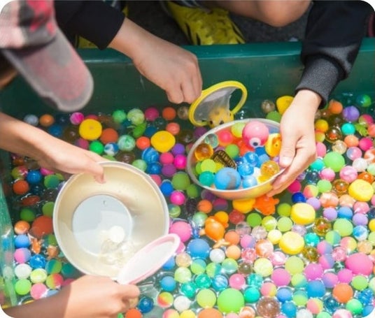カラフルなスーパーボールをすくう、昔ながらの縁日ゲーム。いくつすくえるかな?