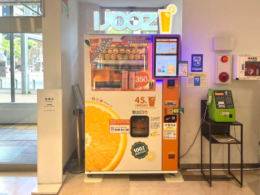 生搾りオレンジジュースの自動販売機を展開するIJOOZ(アイジュース)株式会社は、2024年7月18日から「えきマチ1丁目姪浜」南口エントランス横で、生搾りオレンジジュース自動販売機の稼働を開始しました。