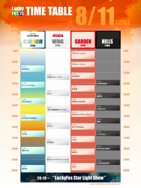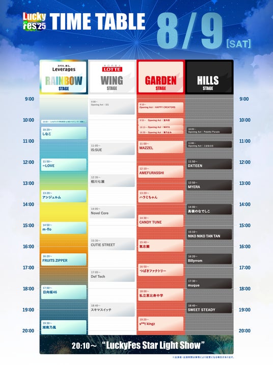 株式会社LuckyFM茨城放送(本社所在地:茨城県水戸市)は、8月9日(土)・10日(日)・11日(月・祝)の3連休に、国営ひたち海浜公園(茨城県ひたちなか市)で開催するLuckyFes'25のタイムテーブルが決まりましたのでお知らせします。合わせて、一般販売も開始します。