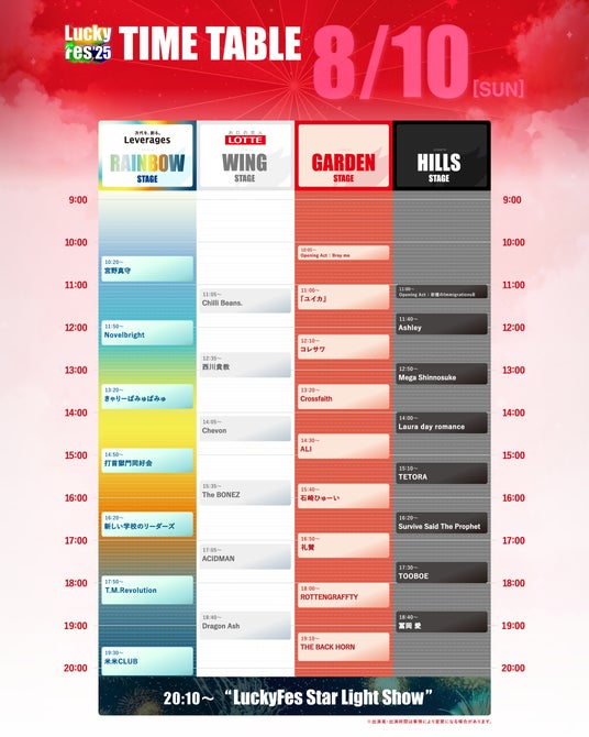 もちろん、フェスの“核”である音楽体験には一切の妥協はありません。本日発表するタイムテーブルは、出演アーティストと来場者が、ひとの“Lucky”な物語を紡いでいけるよう、時間帯ごとの空気、熱量、重なりを丁寧に織り込んで構成しました。