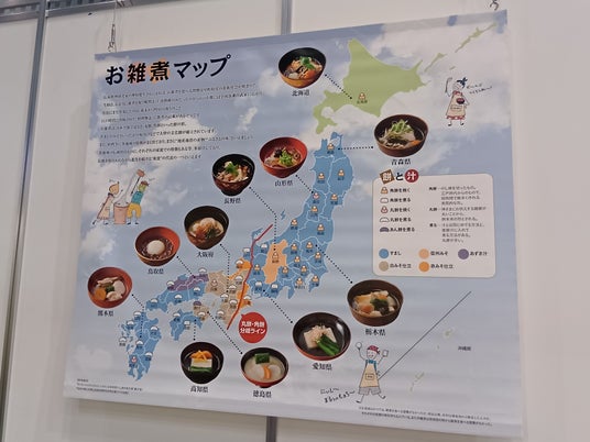 「日本列島お雑煮マップ」の展示。地域ごとの餅の形状や汁の味付けの違いなどを紹介。